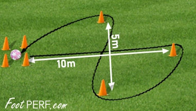 You must end the test by placing your foot on the ball in the middle of the 4 cones (1m²)